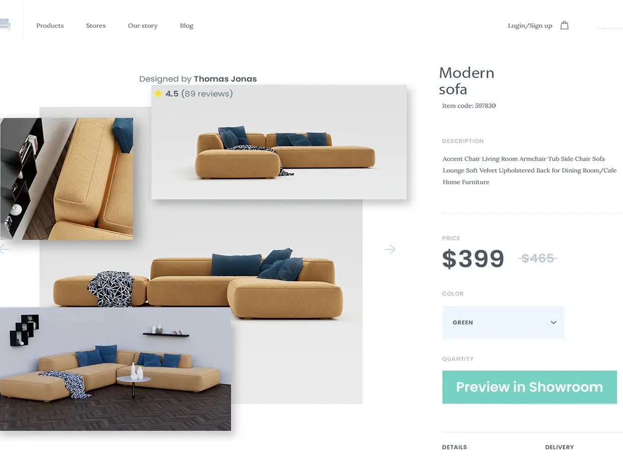 Erstellen Sie Produktbündel in virtuellen Showrooms und präsentieren Sie komplette Einrichtungsideen – mit perfekt abgestimmten Materialien, Stilen und Hintergründen. Ideal für Händler, die mehr als Einzelprodukte zeigen wollen.